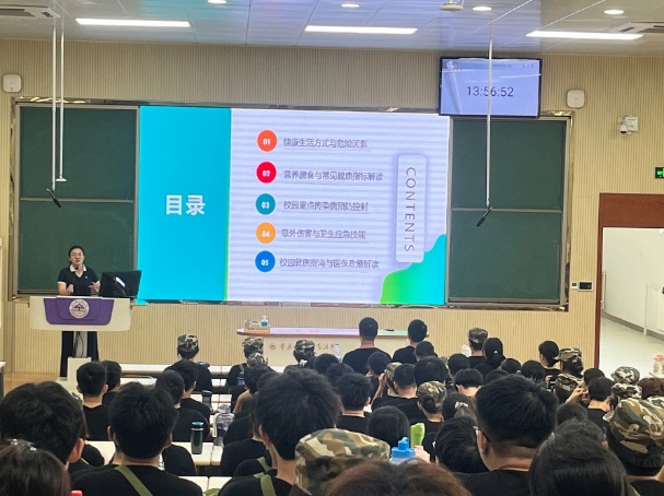在本科生军训理论课堂和研究生入学教育课堂,授课老师为学生详细讲解校园常见传染病、健康生活方式、食品卫生安全等知识,帮助学生树立积极健康的保健意识和生活观念,引导学生通过提高认识、健康饮食、科学运动等方式,铸就健康体魄,保持充沛精力,为顺利完成学业提供健康支撑。