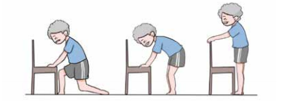 c.双手支撑地面,抬起臀部,弯曲膝关节,然后尽力使自己面向椅子跪立,双手扶住椅面。