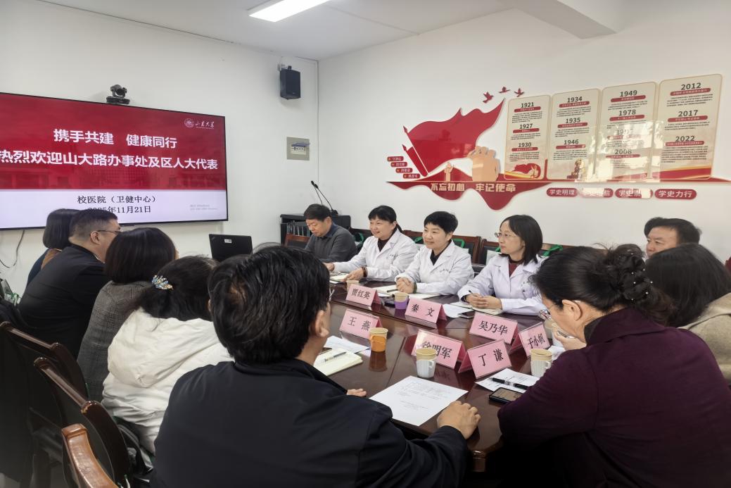 为贯彻落实国家卫健委 “体重管理年” 3 年行动部署,深入了解辖区居民健康及医疗保障工作推进情况, 11 月 21 日上午 9点,山东大学校医院(卫健中心)与山大路办事处及区人大代表于校医院中心院区进行专题调研和座谈。