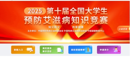为推动防艾知识普及常态化,我校于9月15日至12月15日期间,组织全体师生参与第十届全国大学生预防艾滋病知识竞赛。本次竞赛依托线上平台开展,形成“以赛促学、以学促防”的良好效果,让防艾知识融入日常学习生活,活动仍在继续中。