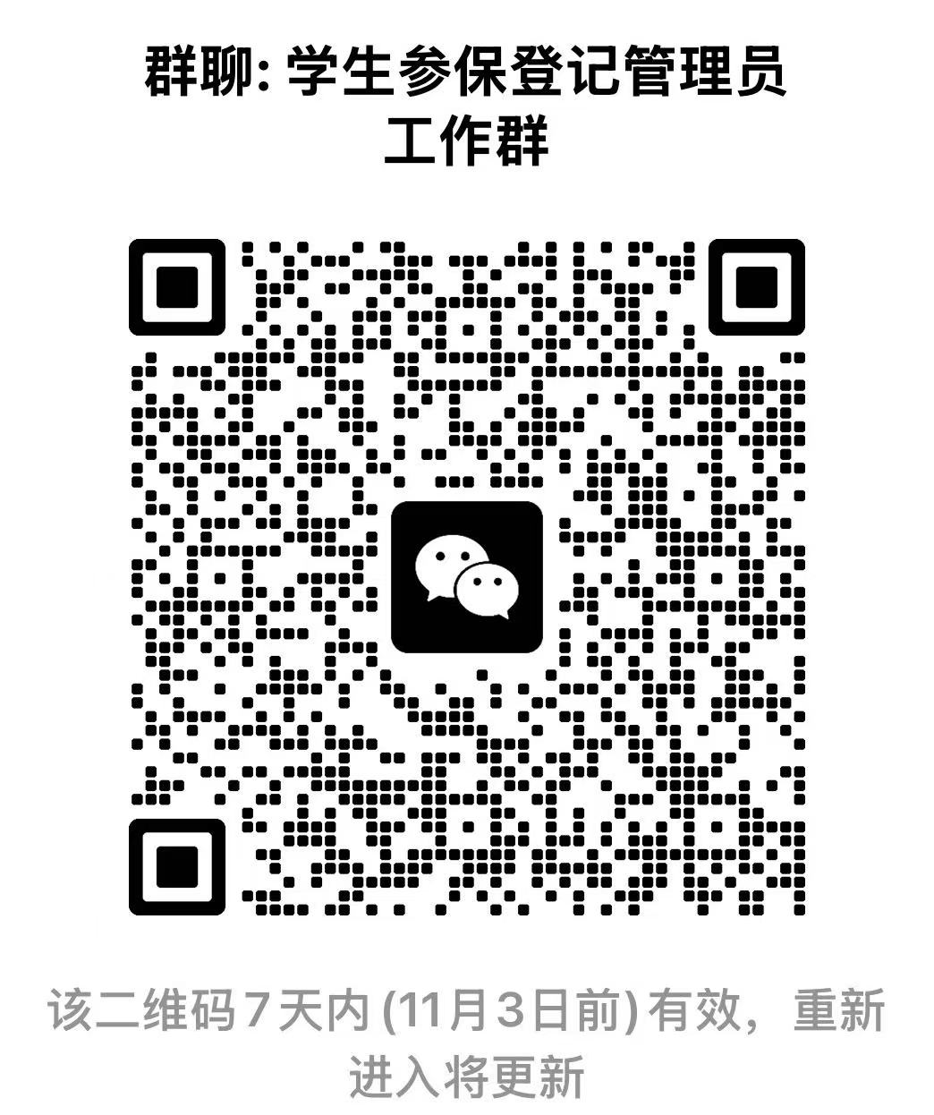 各学院(单位)需指定一至两名老师担任系统管理员,实时关注学生参保情况,并予以及时督促。学院系统管理员须加入学生参保登记管理员微信工作群(学生不得入群),以便及时开通相关权限,并获取咨询和技术支持。